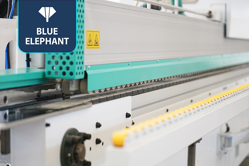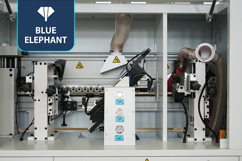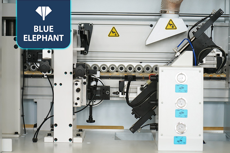该设备采用45°斜边锯,使直板进入板材进行切割铣型成45°斜边,通过斜直胶锅和斜直一体压贴,使封边带与斜直边板材粘合更紧密。